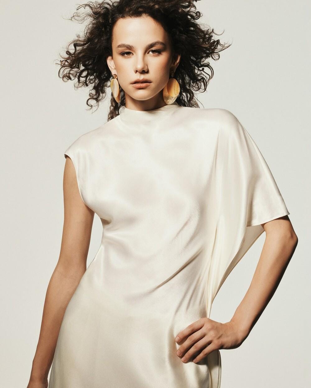 Our silk dress drapes in a flattering A-line cut, brushing the waist and flaring softly. Choose your favorite neckline (Round, V, Square, Boat) and sleeves (from sleeveless to long straight). Satin-lined pockets are discreetly hidden at the hips. Length falls mid-calf or ankle.